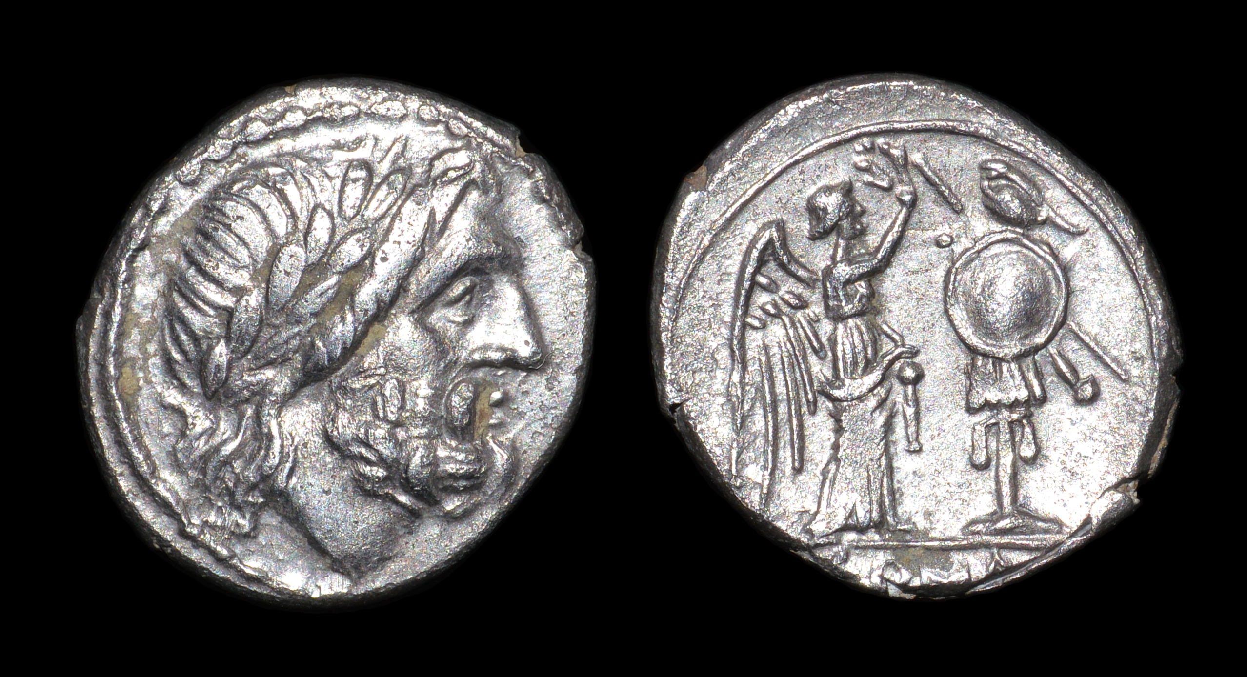 This anonymous victoriatus is probably from a different mint than the Cr. 70/1 victoriati, though both mints were very likely on the island of Sicily. Whereas the Cr. 70/1 victoriati are of very fine style and highly detailed, the 67/1 victoriati are generally less well detailed and more clumsily executed. The trophy with skirt and greaves is the key factor in differentiating these from all the other series as it does not appear on any other fully-anonymous victoriati.