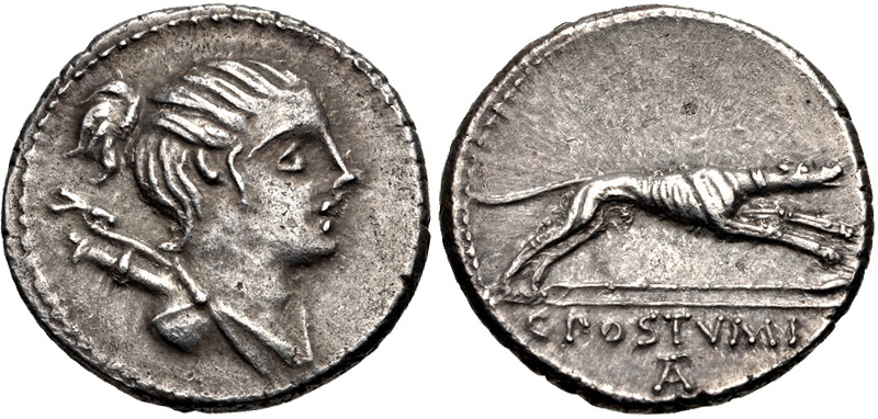 Diana makes regular appearances on the coins of the Postumii, and the family's association with the goddess of the hunt goes all the way back to the Roman Kingdom, well before Rome was the Mediterranean superpower it would have been circa 73 B.C. when this denarius was minted.