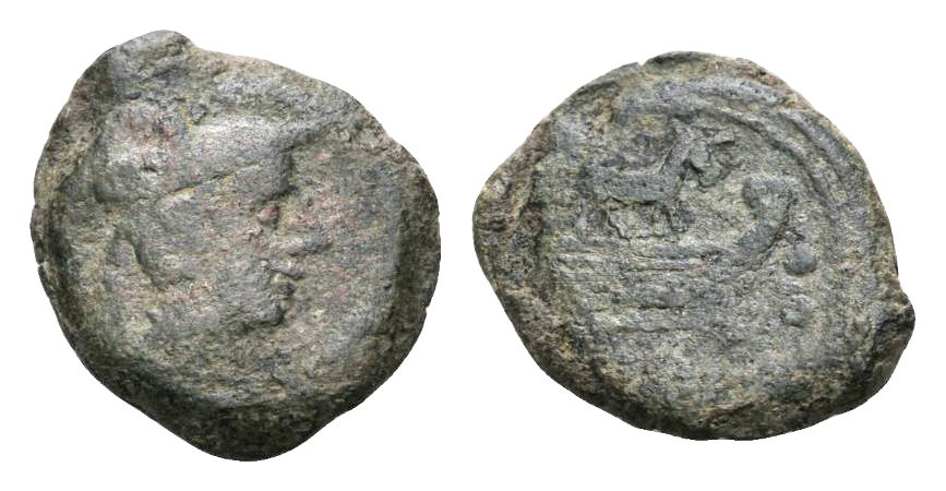 Roman Republic Æ Sextans(6.01g, 21mm, 9h). Ass series, 169-158 BC. Rome mint. Head of Mercury right wearing winged Petasos, •• above / Prow of galley right; ass standing right above; before, ••; below, ROMA. Crawford 195/5