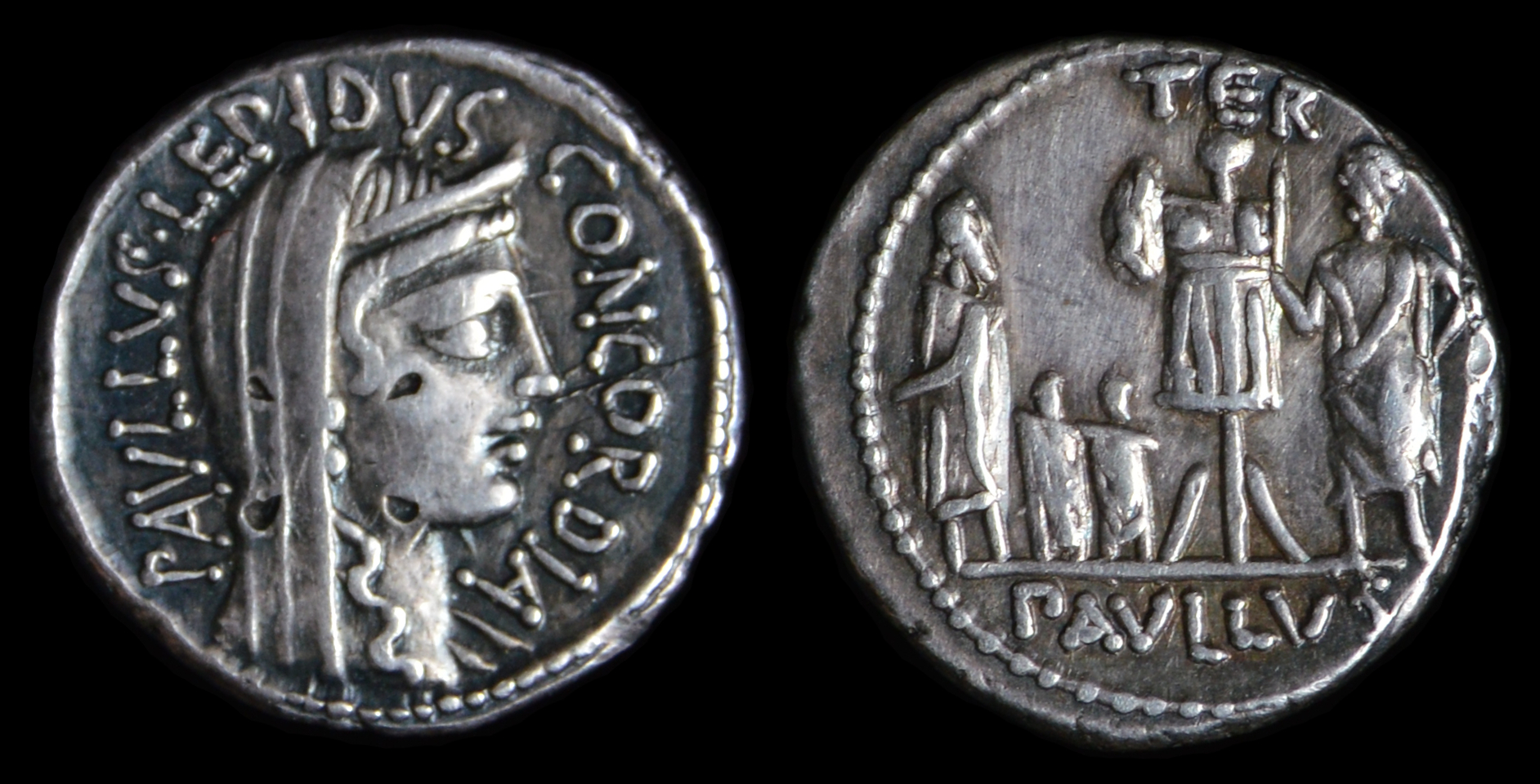Roman Republic AR Denarius(3.98g), L Aemilius Lepidus Paullus, moneyer, 62 BC, Rome mint. Head of Concordia right, wearing veil and diadem; on left, PAVLLVS LEPIDVS upwards; on right, CONCORDIA downwards. Border of dots / Trophy; above, TER; on right, togate figure(L. Aemilius Paullus); on left, three captives (King Perseus of Macedon and his sons); in exerge, PAVLLVS. Border of dots. Crawford 415/1