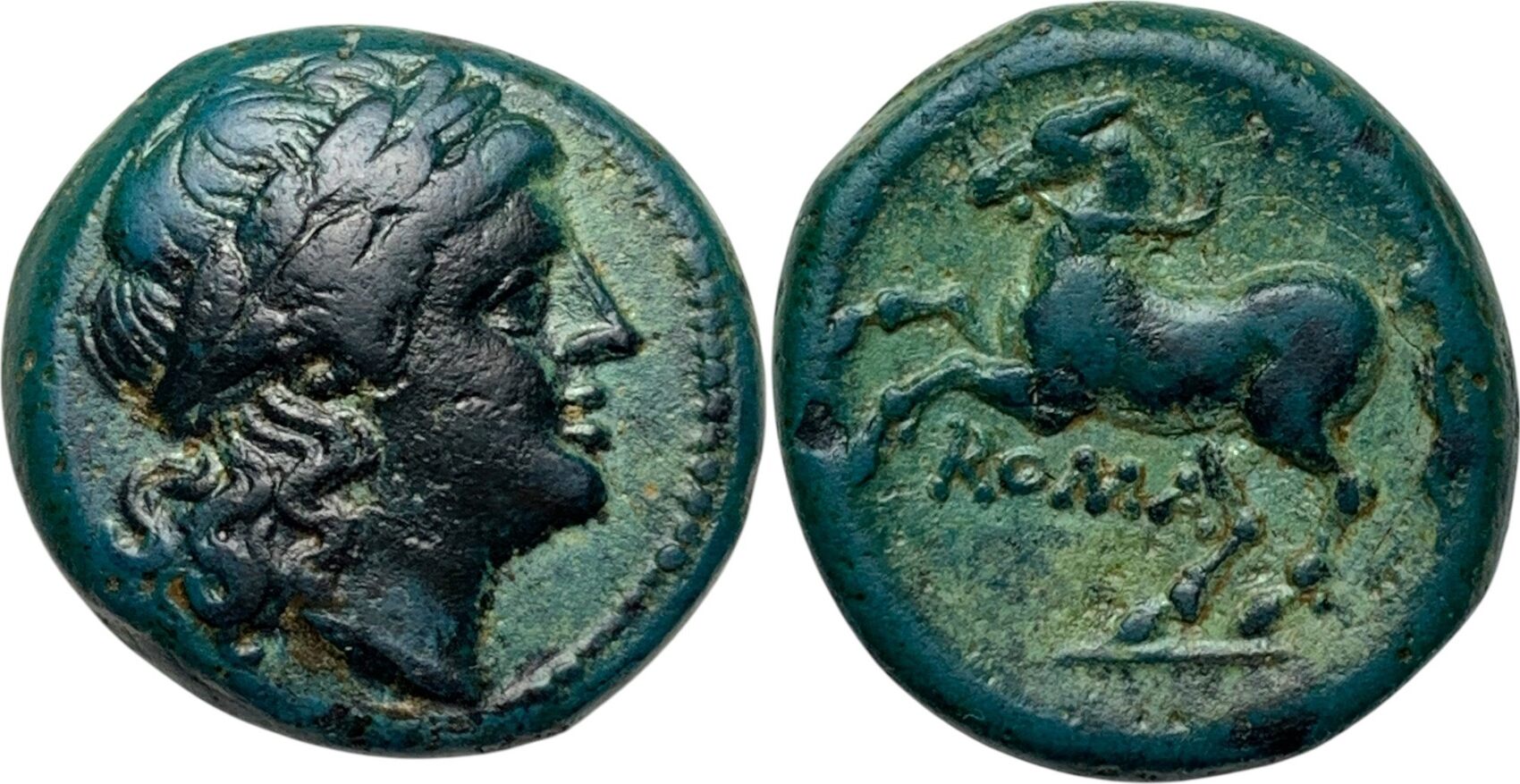 Part of a series of struck coins featuring Apollo/Horse devices which include didrachm, drachm and litra.