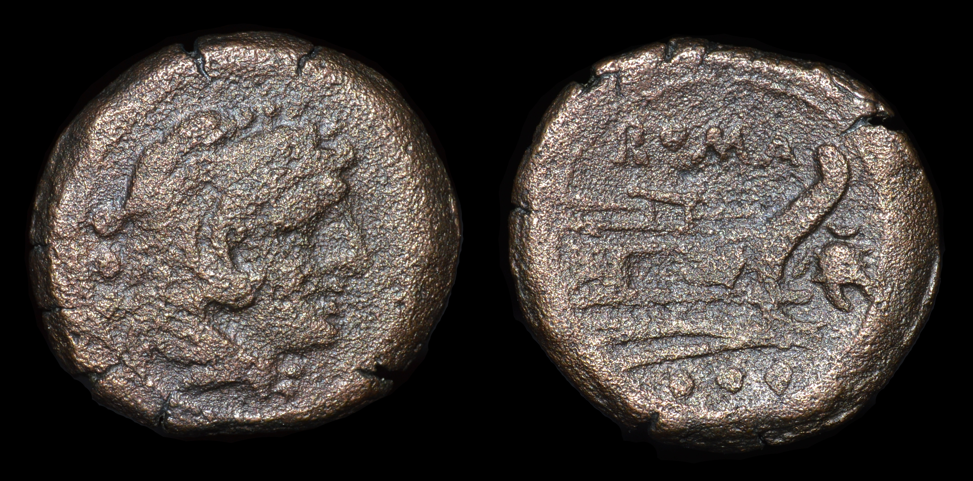 Roman Republic Æ quadrans(22.9mm, 9.66g). Anonymous(Helmet series), 206-195 B.C., Rome mint. Head of hercules right; behind ••• /Prow right; before, sow; above, ROMA; below, •••. Crawford 118/4; Sydenham 272c